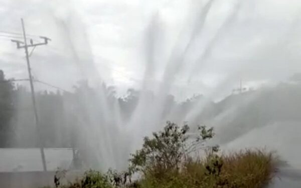 Dari video yang diterima awak media ini, akibat putusnya sambungan pipa induk itu, air menyembur deras ke luar.
