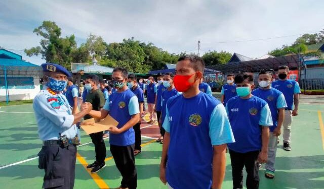 TARAKAN – Kepala Lembaga Pemasyarakatan Kelas IIA Tarakan Yosef Benyamin Yambise menyerahkan sertifikat kepada warga binaan yang telah mengikuti pelatihan membuat roti dan bakso ikan, Kamis (17/11/2021).