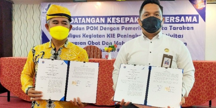 TARAKAN – Wali Kota Tarakan dr. H. Khairul M.Kes dengan Kepala Balai Pengawasan Obat dan Makanan (POM) Tarakan Harianto Baan melakukan penandatanganan kesepatakan bersama, dirangkai dengan kegiatan komunikasi, informasi dan edukasi Peningkatan Aktivitas Pengawasan Obat dan Makanan di Swiss-belhotel Tarakan, Kamis (17/2/2022).