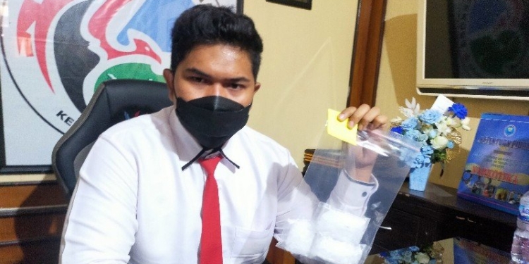 Kasat Reskoba Polres Tarakan Ipda Dien F Romadhoni memperlihatkan barang bukti sabu yang diamankan. (foto: jendelakaltara.co)