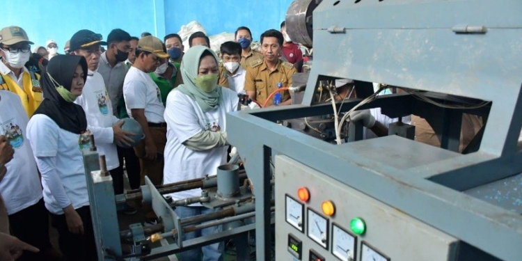 Bupati Nunukan Hj. Asmin Laura Hafid dan Forkopimda serta tamu undangan melihat mesin pengolahan sampah plastik menjadi pelampung laut. (foto: PHI Zona 10 Tarakan Field)