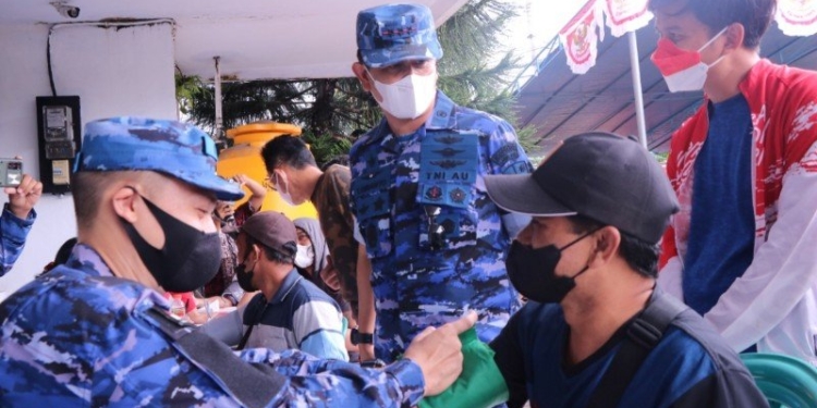 TARAKAN – Komandan Lanud Anang Busra Kolonel Toto Ginanto S.T, M.A.P, M.Han, mendampingi Kepala Bandan Intelijen Negara Daerah (Kabinda) Kalimantan Utara (Kaltara) Marsma TNI Aminul Hakim meninjau kegiatan vaksinasi serentak Covid-19 yang diselenggarakan atas kerjasama Lanud Anang Busra dengan Binda Kaltara.