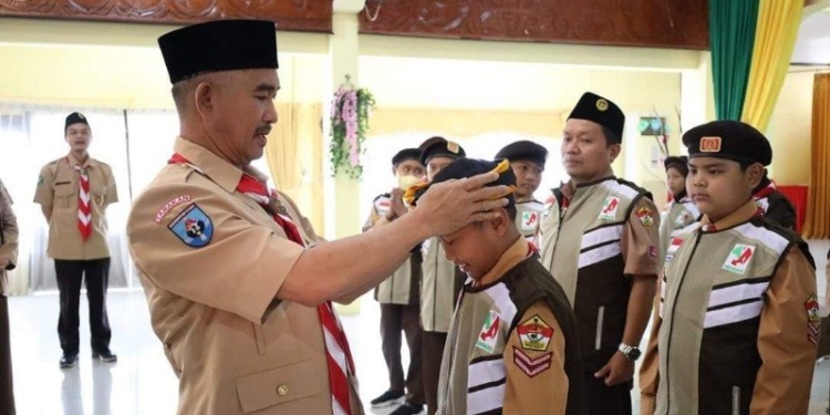 Wali Kota Tarakan dr. H. Khairul M.Kes memasangkan baret kepada anggota Pramuka Ulul Albab. (foto: Bagian Prokompim Setda Tarakan)