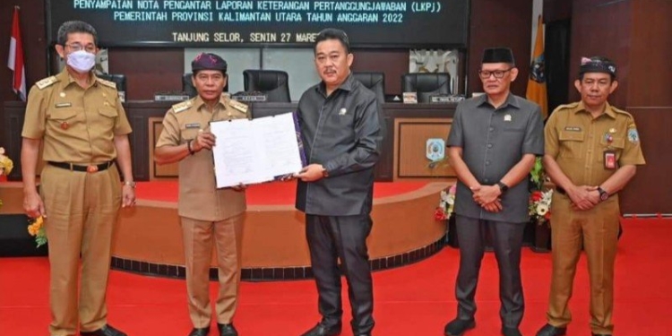 Rapat Paripurna diakhiri dengan penandatanganan berita acara dan Penyerahan dokumen Laporan Keterangan Pertanggungjawaban (LKPj) Pemprov Kaltara oleh Gubernur kepada Ketua DPRD Kaltara. (hms)