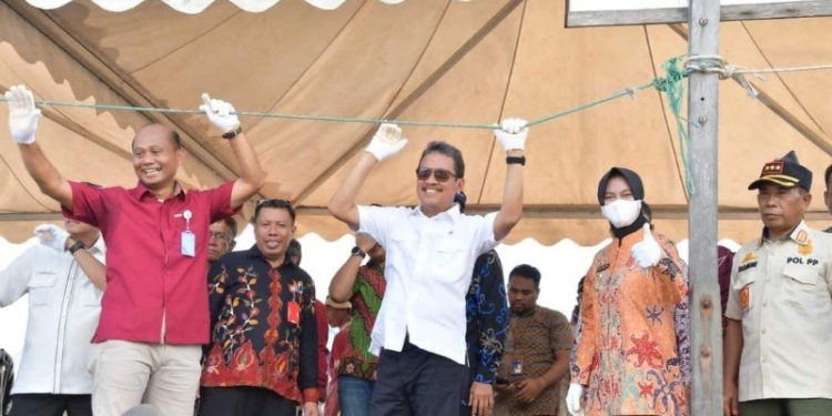 NUNUKAN – Bupati Nunukan, Hj. Asmin Laura Hafid S.E, M.M, Ph.D mendampingi kunjungan kerja (kunker) Menteri Kelautan dan Perikanan, Sakti Wahyu Trenggono ke Kampung Budidaya Rumput Laut, Mamolo, Kelurahan Tanjung Harapan, Kamis (30/3/2023).