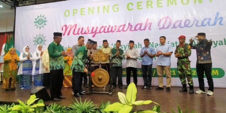 Wali Kota Tarakan dr. H. Khairul M.Kes memukul gong tanda dibukanya Musda Persyarikatan Muhammadiyah Tarakan, ‘Aisyiyah Tarakan dan Nasyiatul ‘Aisyiyah Tarakan. (foto: jendelakaltara.co)
