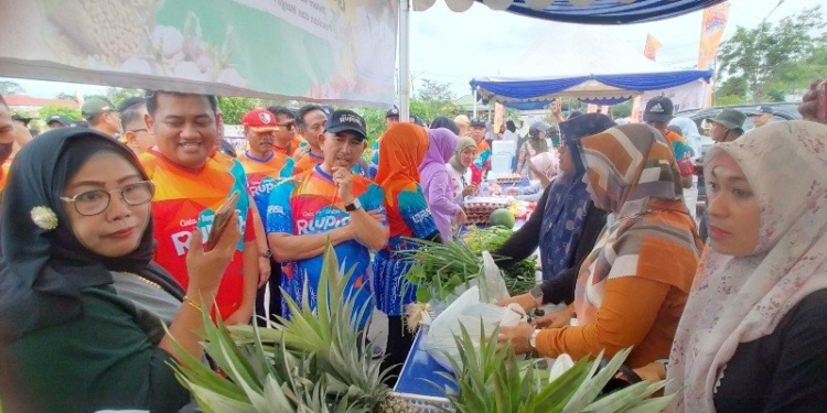 Wali Kota Tarakan, dr. H. Khairul M.Kes bersama Kepala Perwakilan BI Provinsi Kaltar, Wahyu Indra Sukma melihat produk pertanian yang ditampilkan pada Gebray CBP Rupiah. (foto: jendelakaltara.co)