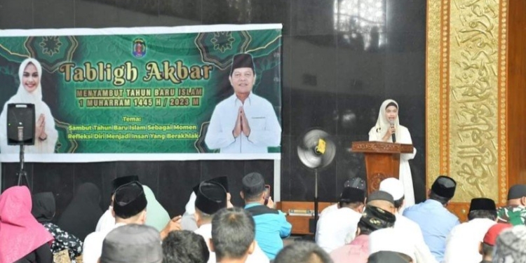 NUNUKAN – Bupati Nunukan, Hj Asmin Laura Hafid S.E, M.M, Ph.D bersama Wakil Bupati Nunukan, H. Hanafiah S.E, M.Si hadir pada Tabligh Akbar menyambut Tahun Baru Islam, 1 Muharram 1445 Hijriah, Rabu (19/7/2023).