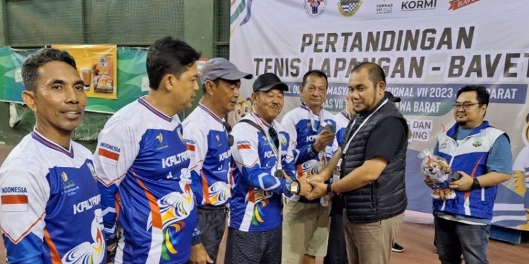 Ketua Kontingen Kaltara, Safril Husin menyerahkan medali dan maskot kepada tim tenis veteran Kaltara yang meraih medali perak. (foto: jendelakaltara.co)