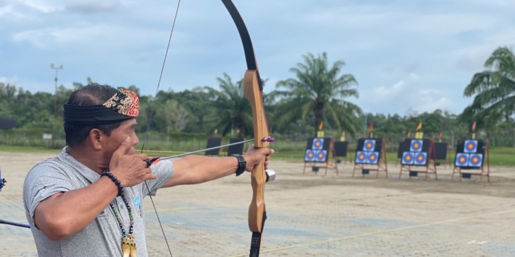 Gubernur Kaltara, Drs. H. Zainal Arifin Paliwang S.H, M.Hum mencoba membidik sasaran dengan busur panah. (foto: DKISP Kaltara)