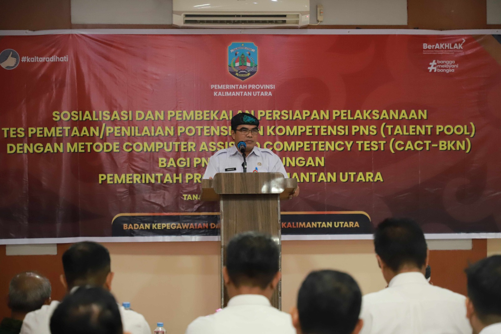 TANJUNG SELOR – Sebanyak 500 Aparatur Sipil Negara (ASN) di lingkungan Pemerintah Provinsi Kalimantan Utara mengikuti Pembekalan Persiapan Pelaksanaan Tes Pemetaan/Penilaian dan Kompetensi PNS (Talent Pool) dengan Metode Computer Assisted Competency Test (CACT-BKN), Rabu (5/7/2023).