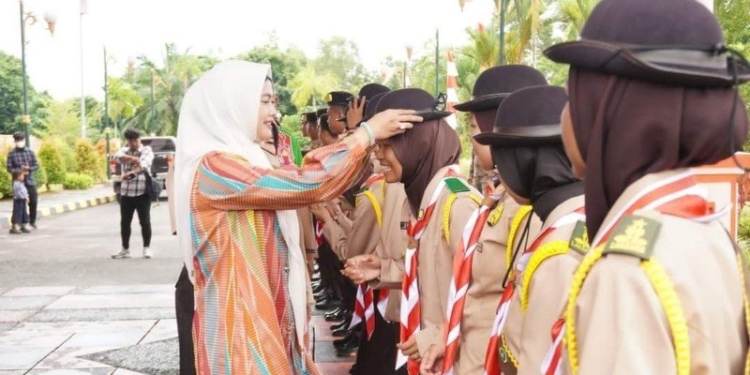 NUNUKAN – Bupati Nunukan, Hj. Asmin Laura Hafid S.E, M.M, Ph.D selaku Ketua Majelis Pembimbing Cabang Gerakan Pramuka Nunukan melepas Kontingan Cabang Pramuka Nunukan menuju Raimuna Nasional XII di Jakarta di halaman Kantor Bupati Nunukan, Kamis (10/8/2023).