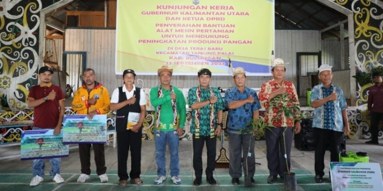 TANJUNG SELOR – Usai meninjau normalisasi Sungai Selor, Gubernur Kalimantan Utara (Kaltara) Drs. H. Zainal Arifin Paliwang, S.H, M.Hum menyerahkan bantuan alat mesin pertanian di Balai Adat Pamung Tawai, Desa Teras Baru, Kecamatan Tanjung Palas pada, Sabtu (23/9/2023).