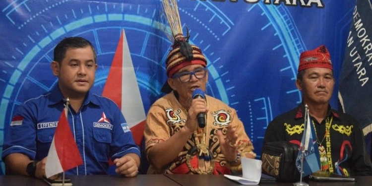 Aliansi Masyarakat Peduli Kaltara memberi keterangan pers usai mengambil formulir ke Sekretariat DPD Partai Demokrat Kaltara untuk Yansen TP. (foto: IST)