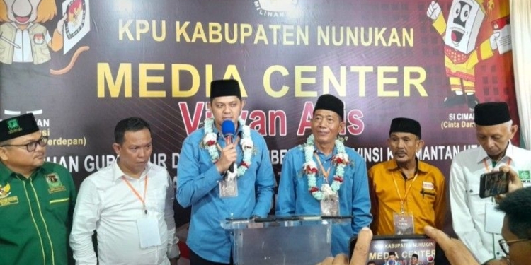 Bakal Calon Bupati dan Wakil Bupati Nunukan, Andi Akbar - Servianus memberikan keterangan pers usai mendaftar di KPU Nunukan. (foto: Tim GAAS)