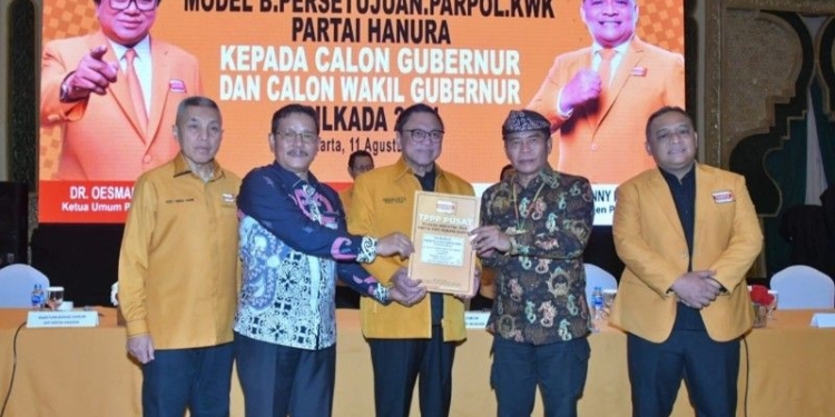 Surat diserahkan langsung Ketua Umum DPP Partai Hanura, Oesman Sapta Odang (OSO) kepada Zainal A Paliwang didampingi pasangannya Ingkong Ala di Kantor DPP Hanura pada Minggu (11/8/2024).