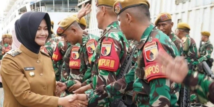 NUNUKAN – Bupati Nunukan, Hj. Asmin Laura Hafid, S.E, M.M, Ph.D melepas Satgas Pamtas RI-Malaysia, Batalyon Arhanud 8/MBC kembali ke homebase di Sidoarjo, Jawa Timur, Selasa (27/8/2024).