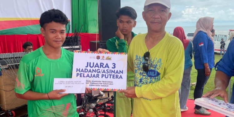 Sekda Tarakan, Jamaluddin (kanan) serahkan simbolis uang pembinaan kepada pemenang lomba olahraga tradisional. (foto: IST)