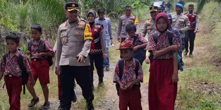 Tak hanya itu Kapolres beserta rombongan juga mengantar mereka hingga ke wilayah perbatasan darat Indonesia-Malaysia. Tepatnya di patok enam, Dusun Berjoko, dengan ikut berjalan kaki bersama para siswa.
