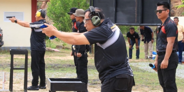 Kapolda bersama Danrem 092/Maharajalila, Brigjen TNI Adek Chandra Kurniawan dan Wakapolda Kaltara, Brigjen Pol Golkar Pangarso Rahardjo Winarsadi turut mencoba menembak.