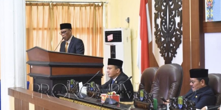 TANJUNG SELOR – Bupati Bulungan, Syarwani, S.Pd, M.Si didampingi Wakil Bupati, Kilat, A.Md menyampaikan visi dan misi 2025 – 2030 dalam rapat paripurna DPRD Bulungan pada Senin (10/3/2025).