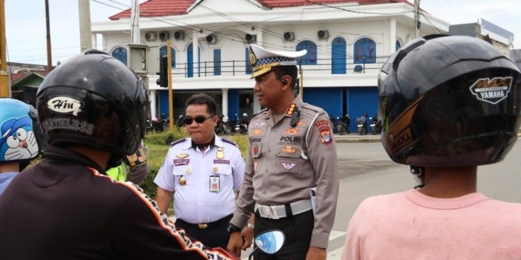 Dirlantas Polda Kaltara, Kombes Pol Mohammad Syarhan (kanan) bersama Kepala Dinas Perhubungan Bulungan, Yunus Luat mensosialisasika Ruang Henti Khusus (RHK) kepada pengendara. (foto: Humas Polda Kaltara)
