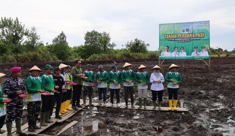 TARAKAN – Wali Kota Tarakan, dr. H. Khairul, M.Kes bersama Wakil Wali Kota, Ibnu Saud, turut melakukan tabur benih padi di lahan cetak sawah Sungai Siaboy, Kelurahan Juata Laut, Selasa (30/9/2025).