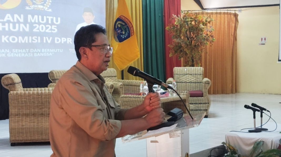 Anggota Komisi IV DPR RI, Mayjen TNI (Purn) Drs. H. Hasan Saleh sampaikan sambutan saat menghadiri Bulan Mutu Nasional di Gedung Serbaguna Kantor Wali Kota Tarakan, Jumat (12/12/2025). (foto: jendelakaltara.co)