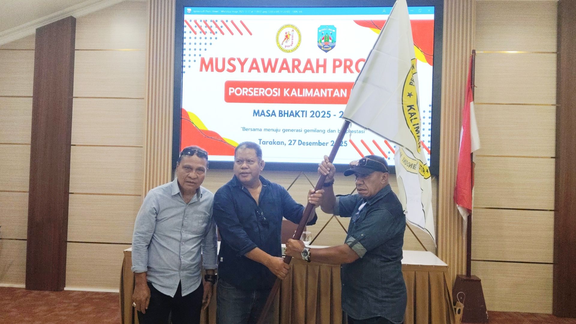 Steve Singgih Wibowo (dua dari kiri) serahkan bendera Perserosi kepada Ketua Perserosi Kaltara yang baru, Maxi Donatus. (foto: jendelakaltara.co)