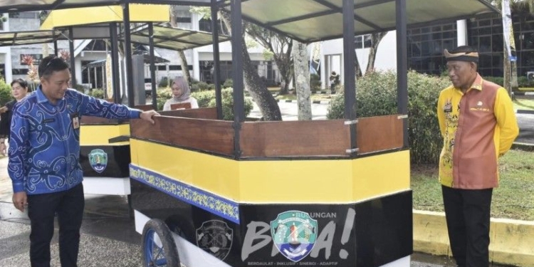 TANJUNG SELOR – Bupati Bulungan, Syarwani, S.Pd, M.Si menyerahkan secara simbolis bantuan 60 unit gerobak kepada 60 Pedagang Kaki Lima (PKL) Tepian Sungai Kayan.