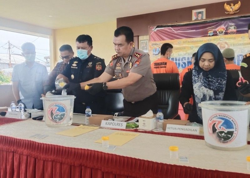 Pemusnahan dipimpin langsung Kapolres Tarakan AKBP Erwin S. Manik, disaksikan sejumlah tamu undangan dan penasehat hukum tersangka di Mako Polres Tarakan, Selasa (14/4/2026).