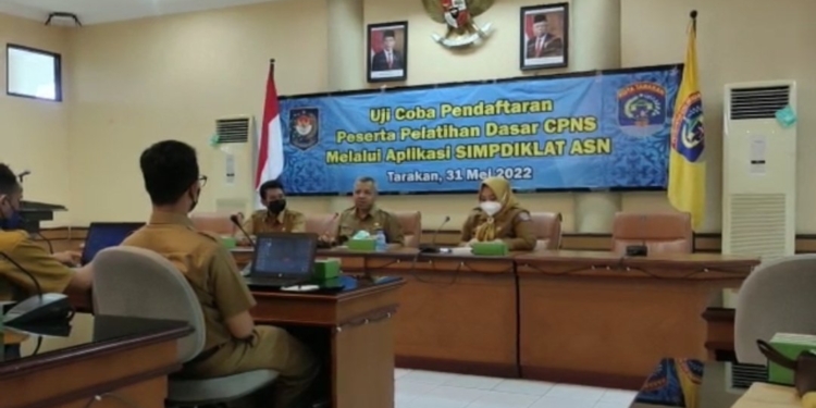 Ujicoba Simdiklat ASN dilakukan pada pendaftaran peserta pelatihan dasar Calon Pegawai Negeri Sipil (CPNS) yang akan digelar Pemkot Tarakan. Kegiatan yang dibuka Sekretaris Daerah (Sekda) Tarakan Hamid Amren di ruang Imbaya Kantor Wali Kota Tarakan, Selasa (31/5/2022) diikuti puluhan ASN di lingkungan Pemkot Tarakan.