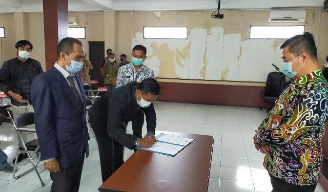 Pjs Gubernur Kaltara Teguh Setyabudi melantik dua anggota BPSK Kota Tarakan di ruang UMKM Center, Jumat (06/11/2020). (foto: jendelakaltara.co)