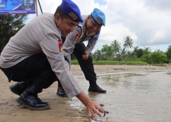 SEBATIK - Kepala Bidang Propam Polda Kaltara, Kombes Pol Krishadi Permadi bersama rombongan melepas tukik (anak penyu) di Pantai Marina ...